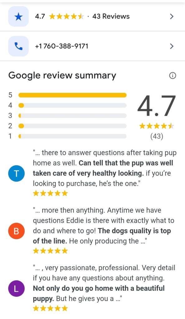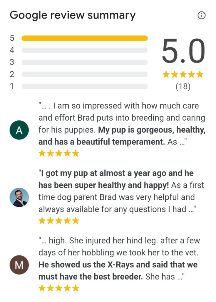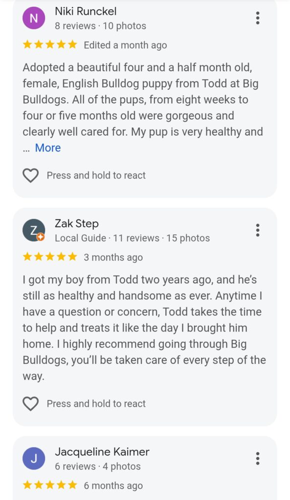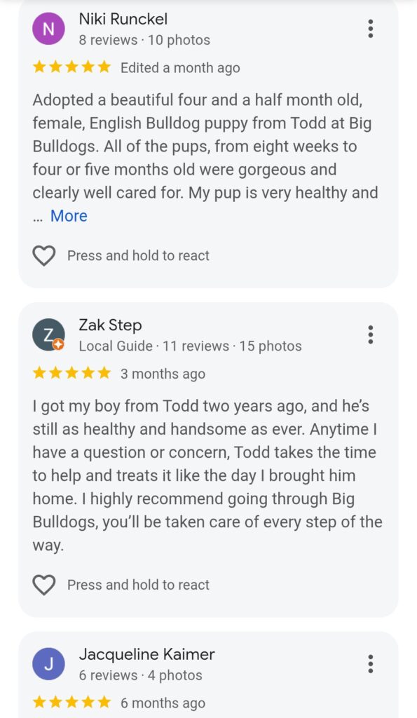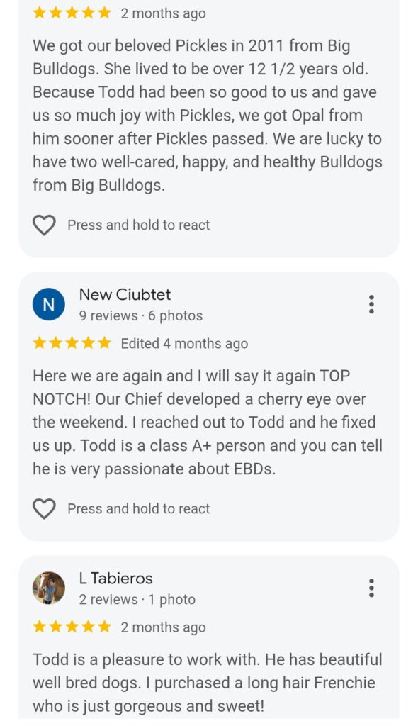 We purchased our puppy from Bulldog & Pit and the process was easy. I was hesitant with my purchase as I’ve not done anything like this before, so I was skeptical as it was a considered purchase. They answered all my questions and I was encouraged to reach out well after and I appreciated. We adore our little one and he was exactly what we asked. ! Our little guy had all of the paperwork with his vaccinations. Our experience was terrific.